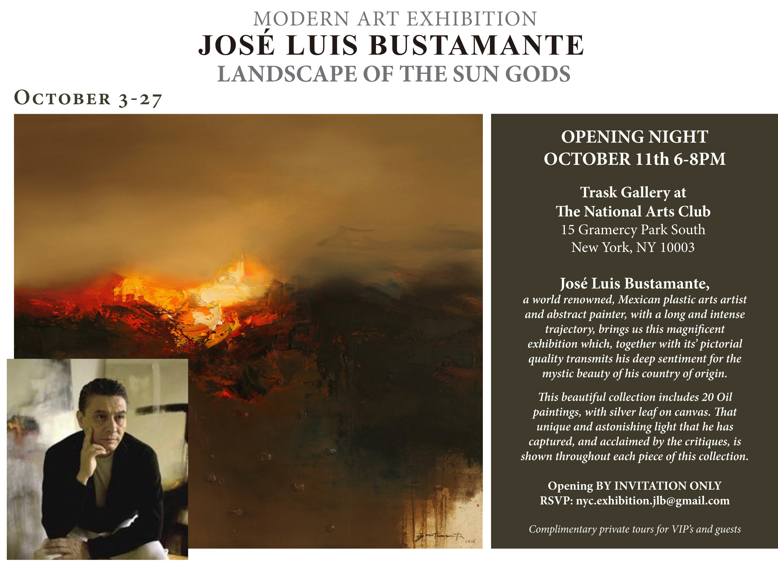 José Luis Bustamante, a world renowned, Mexican plastic arts artist and abstract painter, with a long and intense trajectory, brings us this magnificent exhibition which, together with its’ pictorial quality transmits his deep sentiment for the mystic beauty of his country of origin. This beautiful collection includes 20 Oil paintings, with silver leaf on canvas. That unique and astonishing light that he has captured, and acclaimed by the critiques, is shown throughout each piece of this collection.
